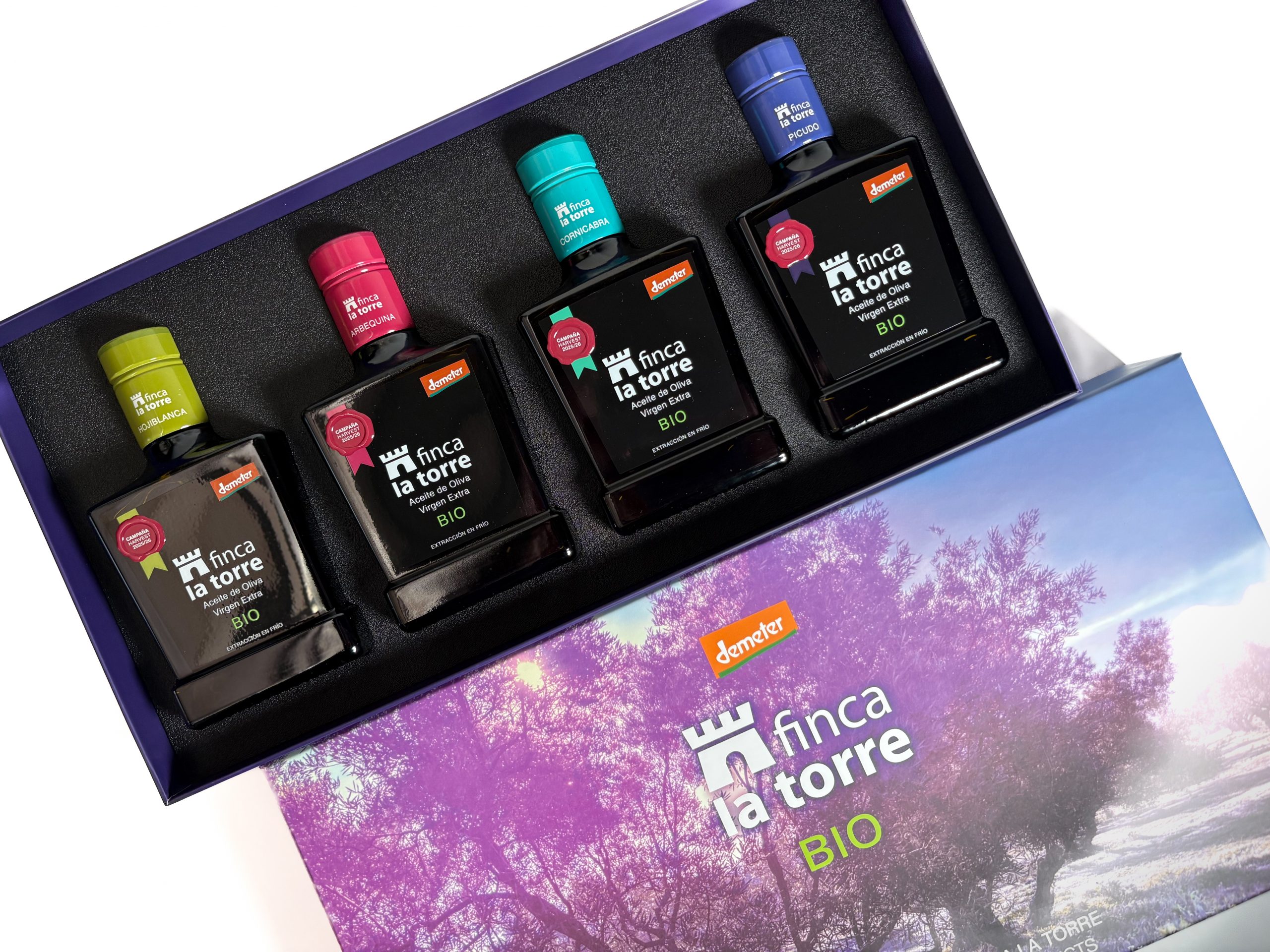 La Colección de aceites de oliva virgen extra ecológicos Finca La Torre reúne las cuatro variedades más emblemáticas de la finca: Hojiblanca, Arbequina, Cornicabra y Picudo. Cada una refleja un perfil sensorial único que permite descubrir la riqueza y diversidad del olivar andaluz.